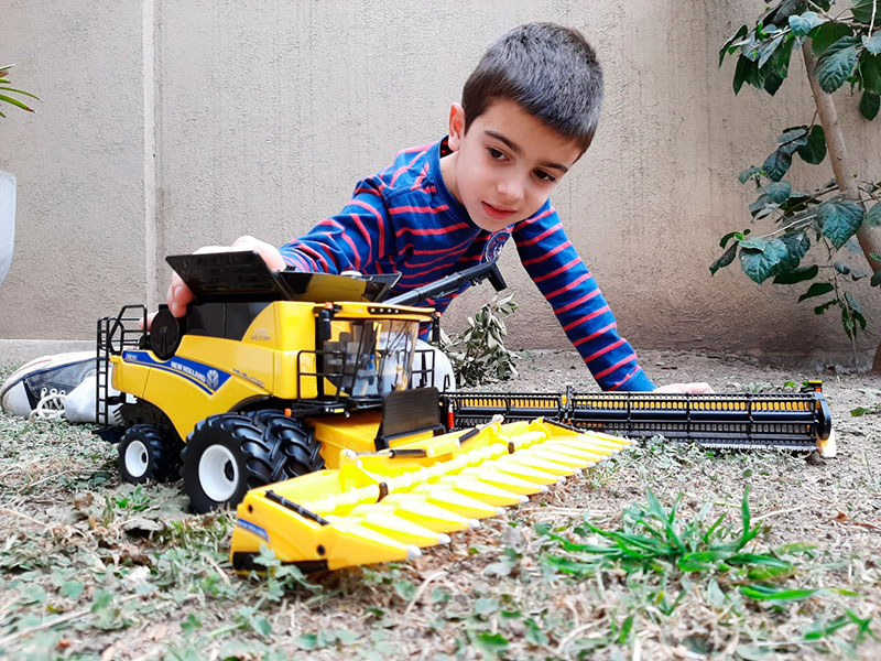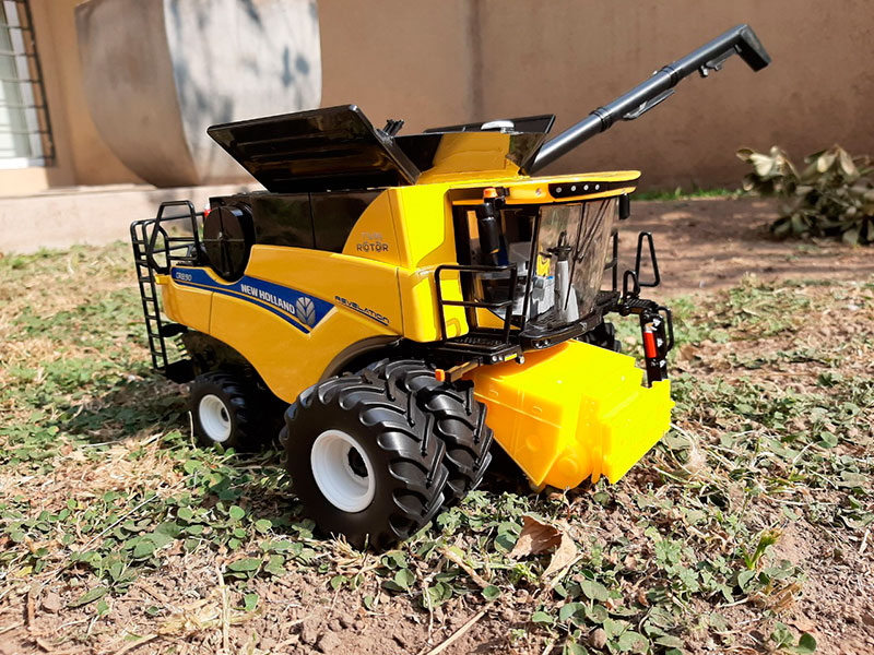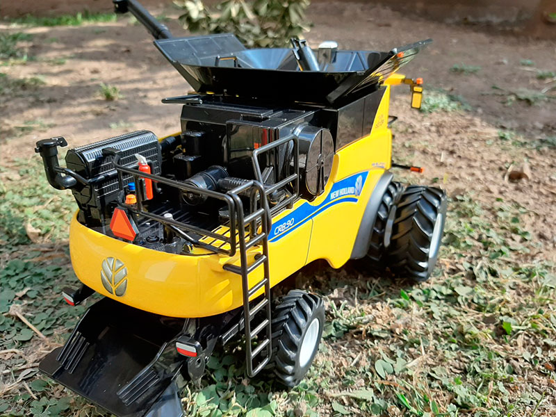Con plataforma drapper y cabezal maicero plegable. ESCALA: 1:32 Metal fundido a presión y partes plásticas. Die-cast metal réplica. Partes móviles. LARGO: 33 cms. ANCHO: 18 cms. ALTO: 14 cms. LARGO CABEZALES: 37.5 cms.